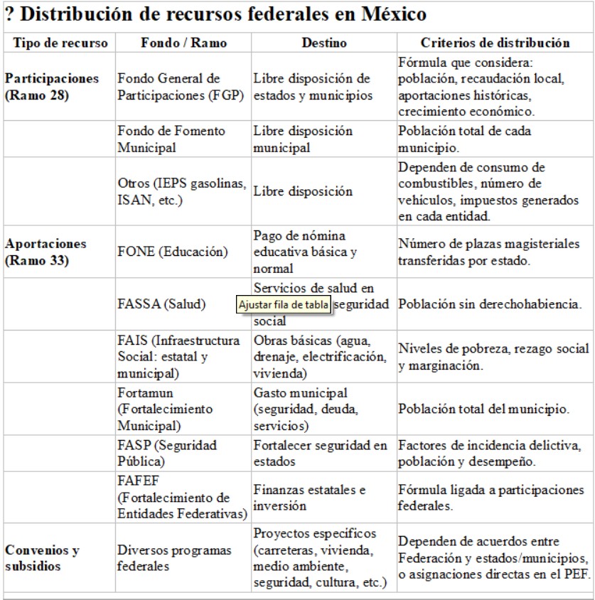 Existen tambien criterios transversales: Población (tamaño y crecimiento); Pobreza y marginación social (particularmente en FAIS); El esfuerzo recaudatorio local para incentivar la recaudación propia; Necesidades sectoriales como laeducación, salud, seguridad, infraestructura;; Equidad y compensación en apoyar más a las entidades con menor desarrollo relativo; Y asignaciones especiales aprobadas en el Presupuesto de Egresos de la Federación (PEF), a veces ligadas a proyectos estratégicos o negociaciones políticas. Disculpando mi falta de ignorancia asumida por quien declaró.
