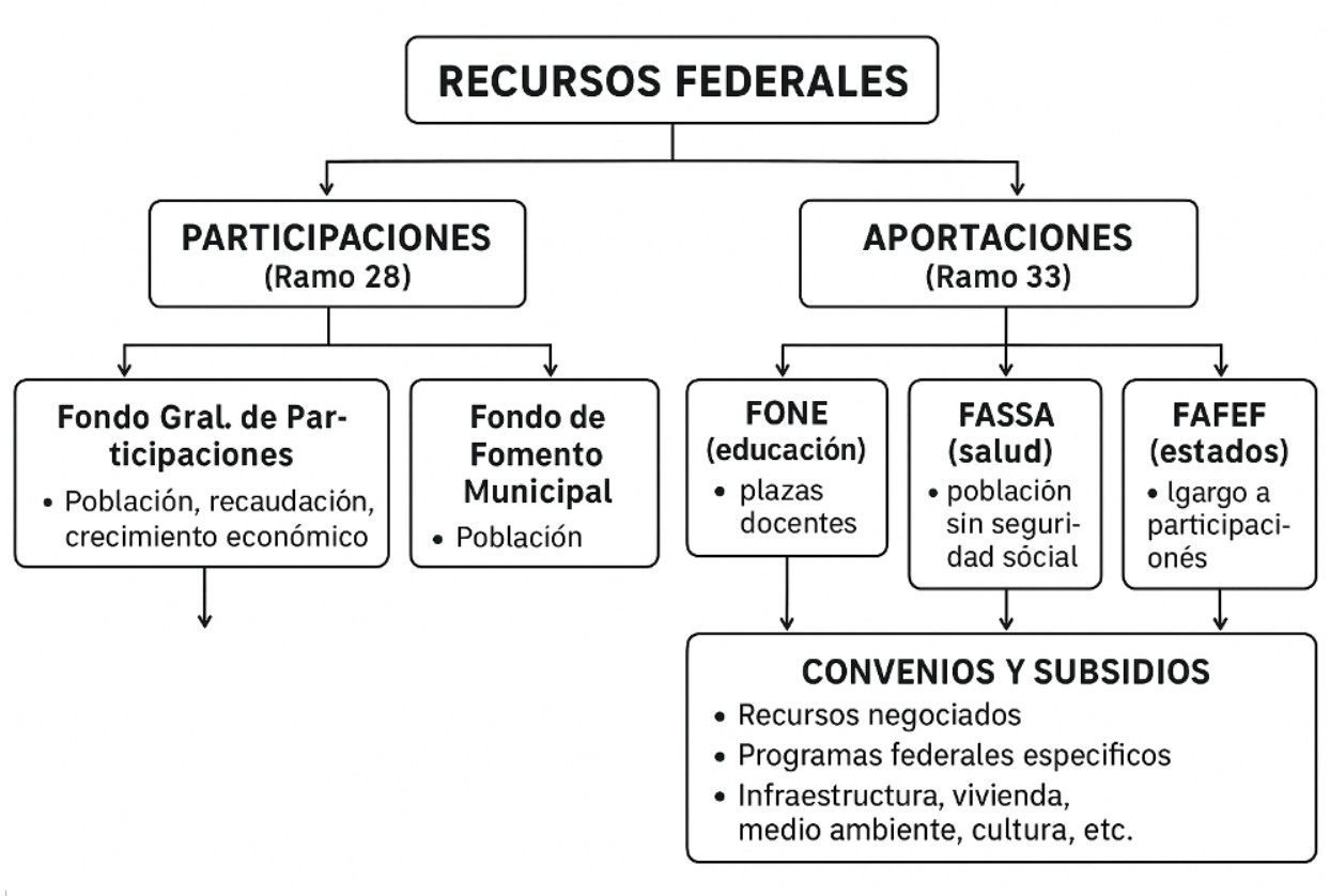 Con respecto al Ramo 28: Son recursos no etiquetados (de libre disposición), y son determinados por la recaudación Federal Participable (RFP) que es el porcentaje de los impuestos y derechos que capta la Federación; La fórmula de distribución del Fondo General de Participaciones considera población, esfuerzo recaudatorio local, aportaciones históricas y nivel de crecimiento económico; y otros fondos de participaciones (como IEPS gasolinas o Impuesto sobre Automóviles Nuevos) se distribuyen con fórmulas específicas.